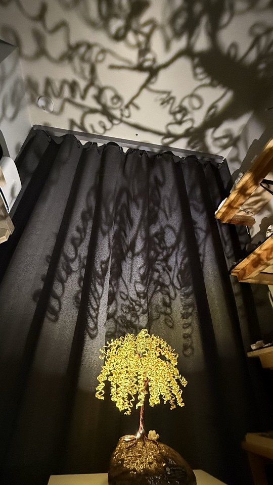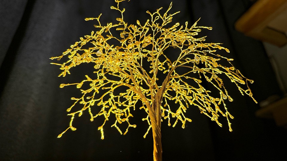 Arbre en fil de Cuivre teinté doré, sur croûte de Bois.